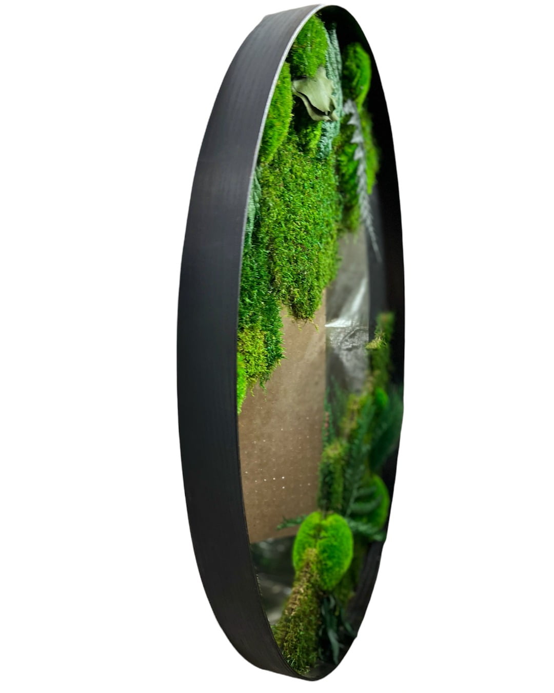 Дзеркало з мохом та рослинами. Джунглі у рамці — це чарівний декоративний елемент для вашого дому. Це кругле дзеркало, обрамлене тонкою дубовою рамкою, прикрашене красивим мохом та зеленим листям папороті.