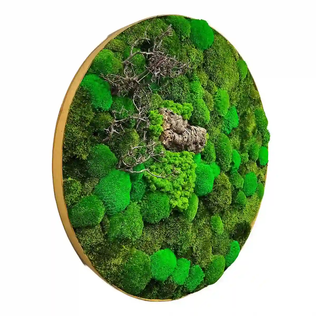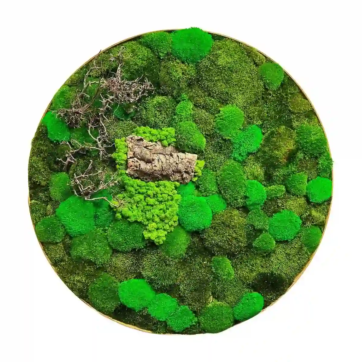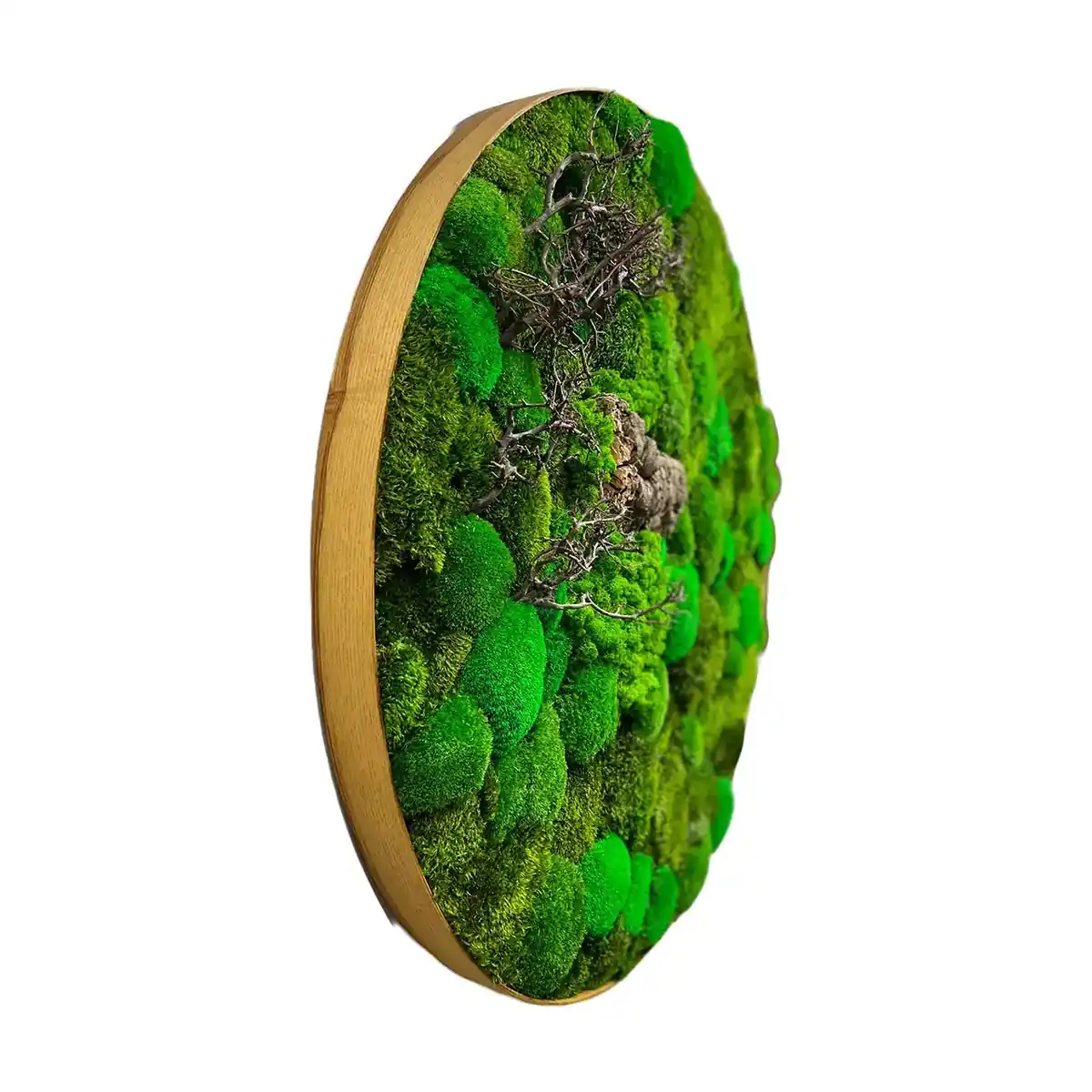 Кругла картина з моху та деревом — це вишуканий елемент декору, який надає будь-якому приміщенню неповторного стилю. Вона ідеально підходить для озеленення стін, створення особливої атмосфери та підкреслення індивідуальності житлових, офісних або громадських приміщень. Натуральний мох дарує природний вигляд та заспокійливий ефект, сприяючи створенню гармонійного середовища.