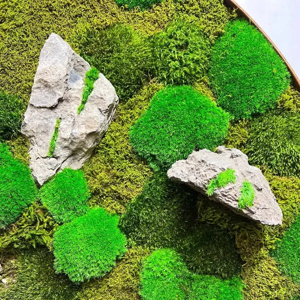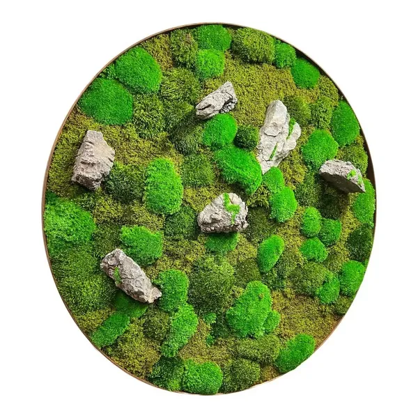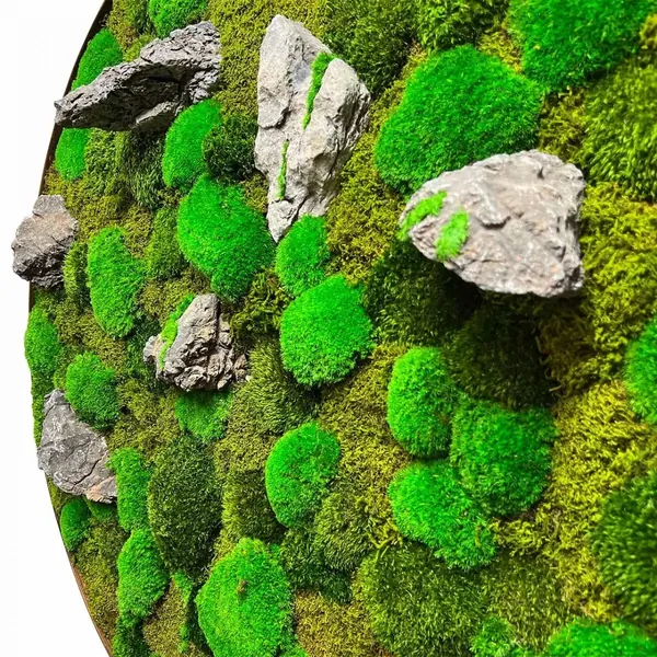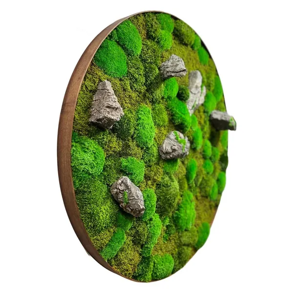 Кругла мохова картина з мохом і каменем не лише естетична, але й практична. Вона легко кріпиться та не потребує поливу, оскільки мох оброблений для тривалого збереження форми без догляду.