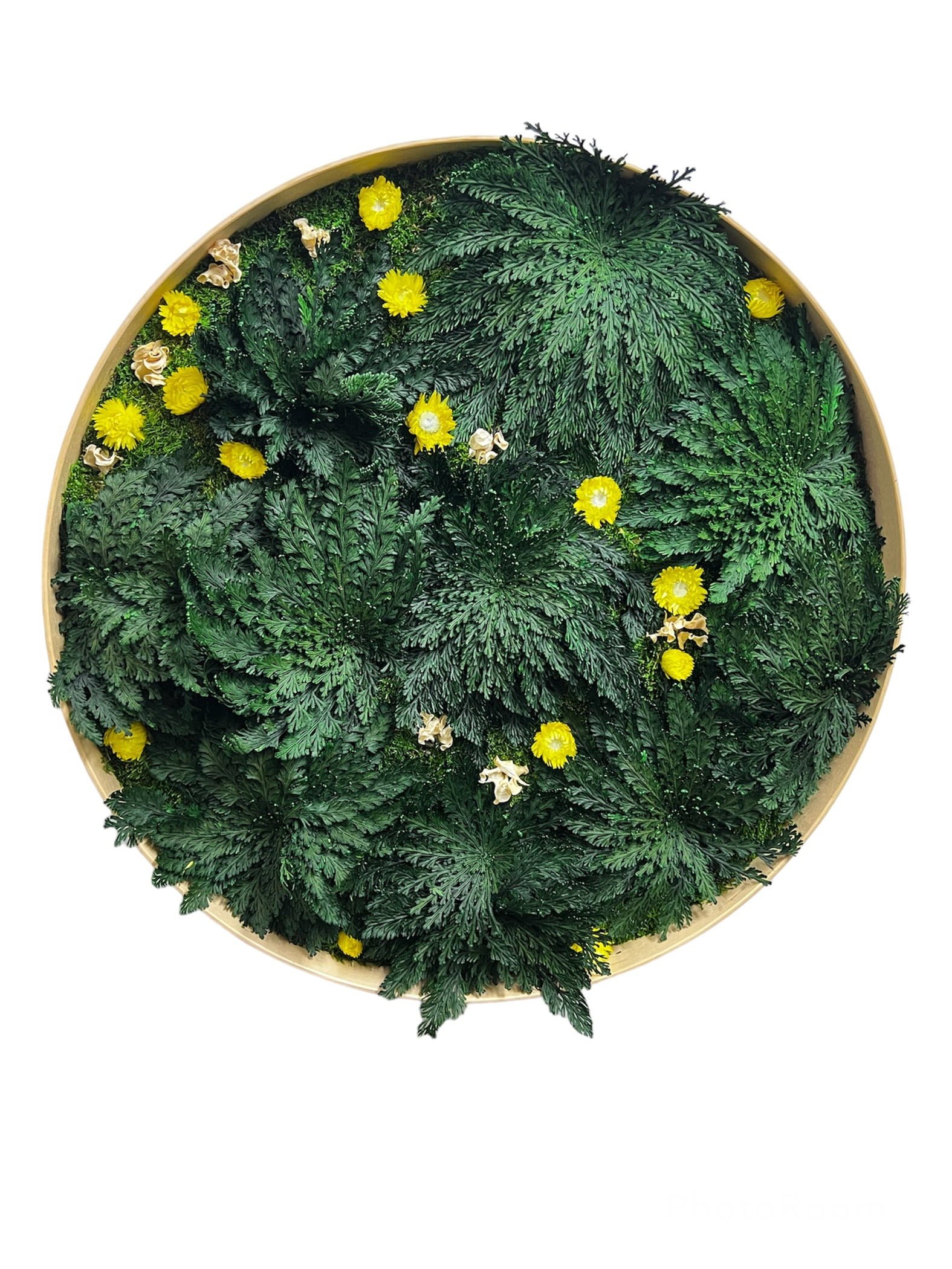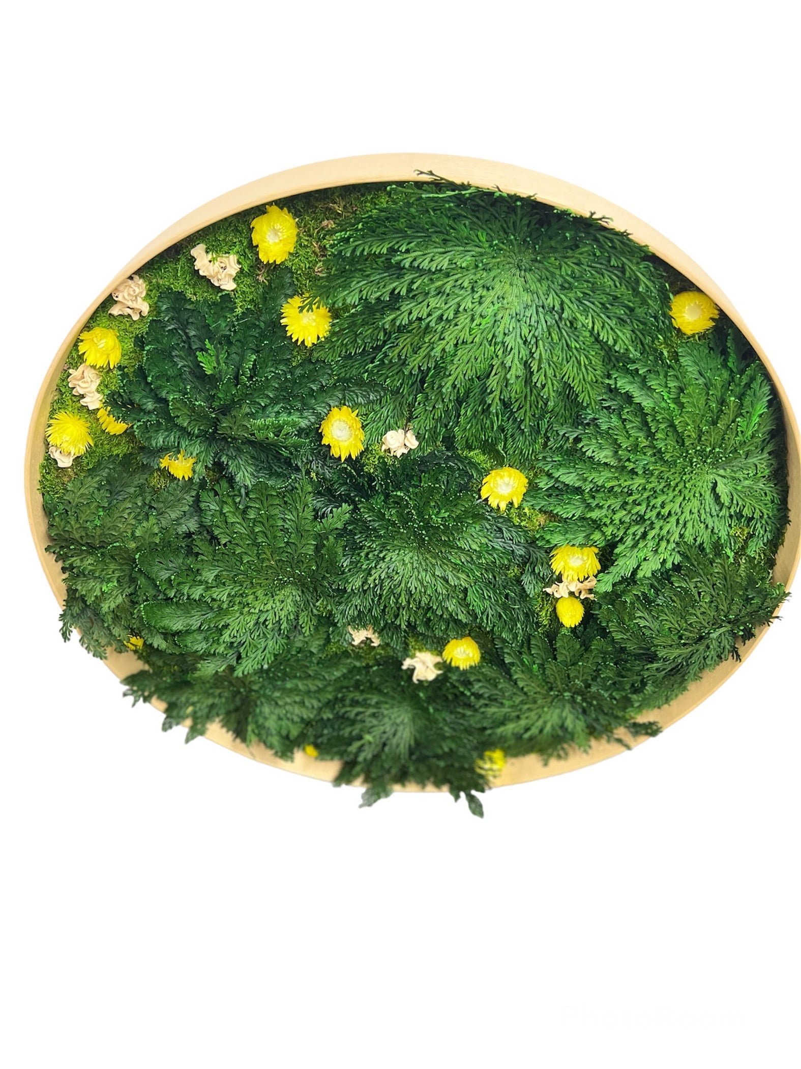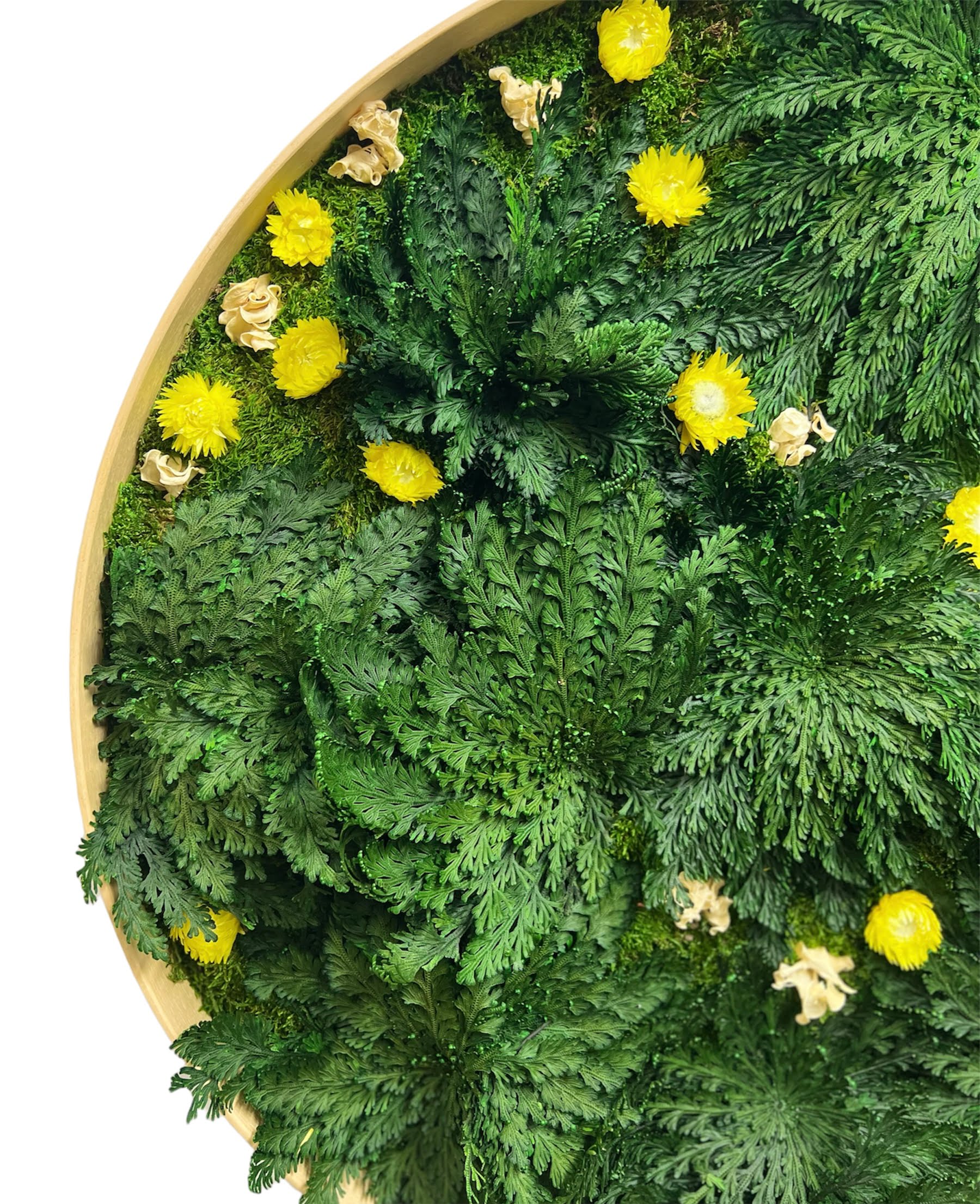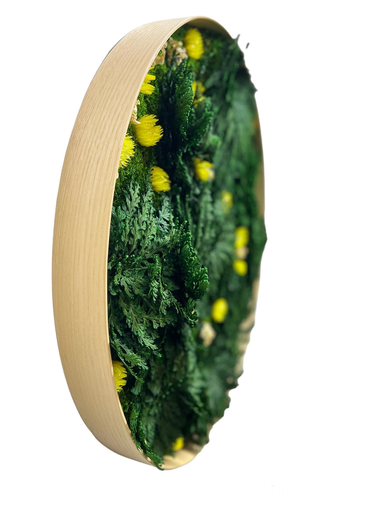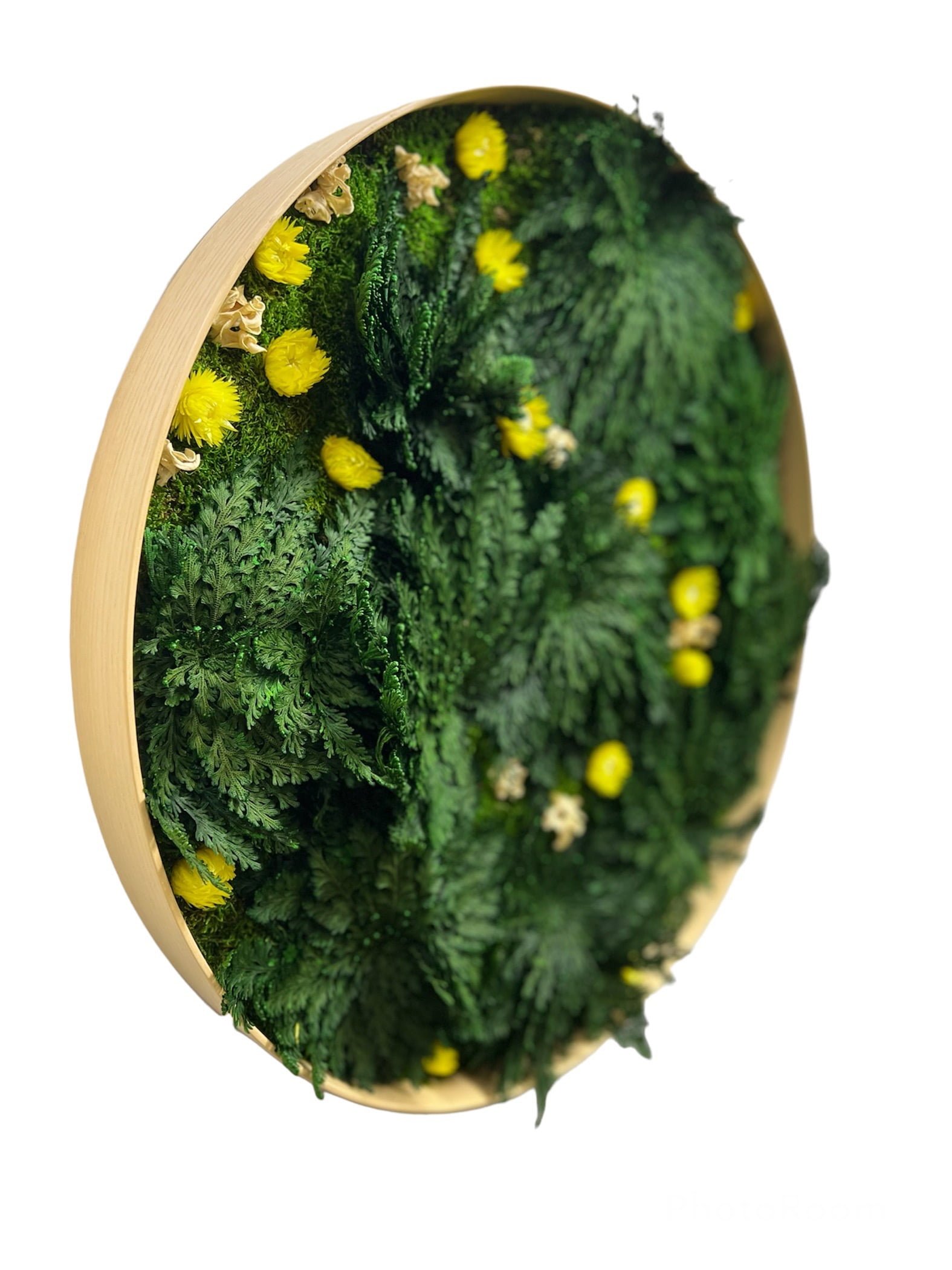У цілому, кругла мохова картина – це витвір мистецтва, що унікально передає красу природи. Зелений мох і яскраво-жовті квіти створюють живу та кольорову композицію, яка запрошує глядача зупинитися і насолодитися природною красою світу.
