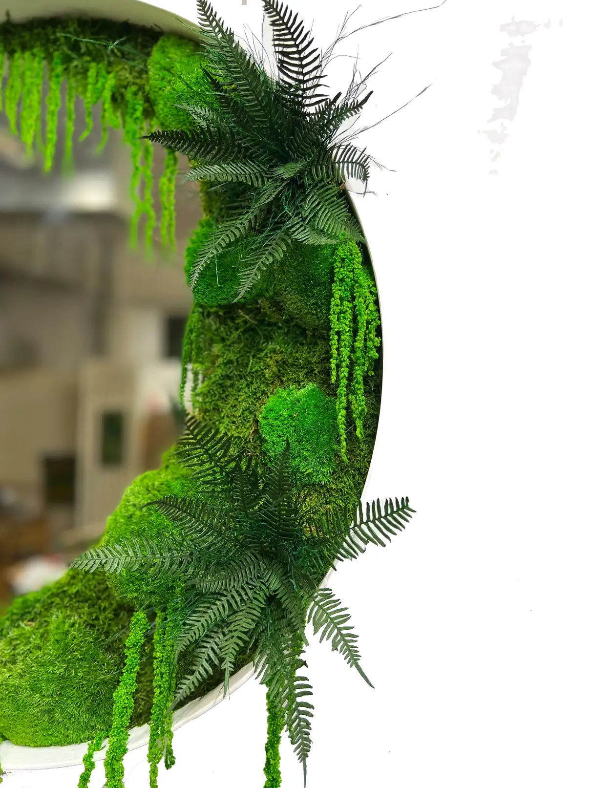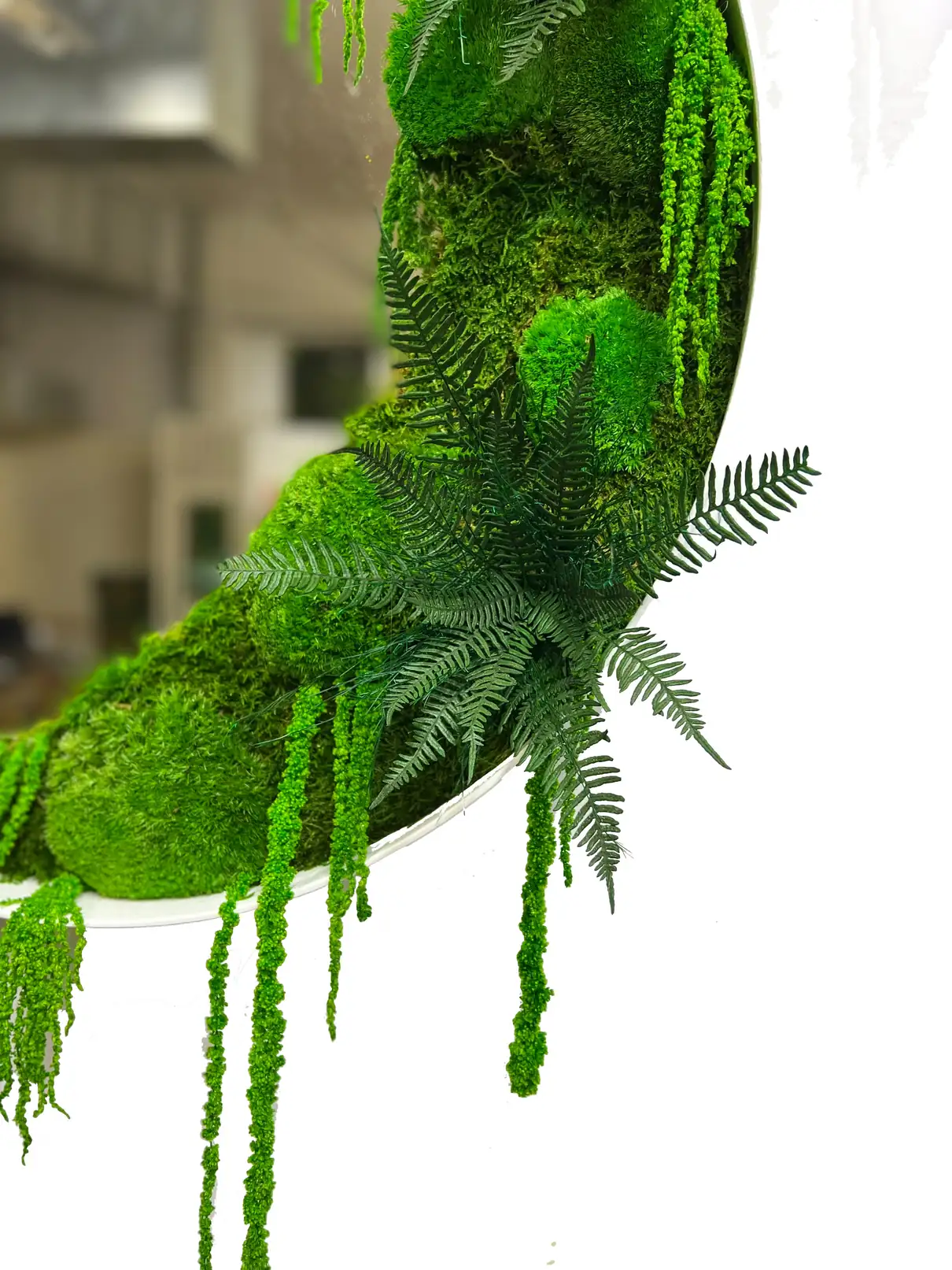 Коротко кажучи, кругле дзеркало з кульовим мохом та рослинами – це універсальний декоративний елемент, який може бути використаний у різних приміщеннях. Воно поєднує функціональність із природною красою. Наші справжні мохи та живі рослини є 100% натуральними та безпечними, а також не потребують догляду, що робить його зручним і довговічним для використання.