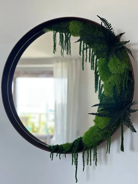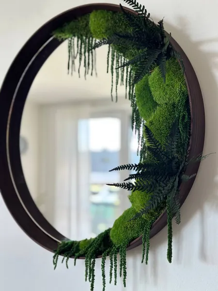 Загалом, кругле дзеркало з кульовим мохом, платмусом, рослинами та папороттю є чудовим прикладом креативного зеленого декору. Мохове дзеркало випромінює спокій і безсумнівно стане цінним доповненням будь-якого простору.