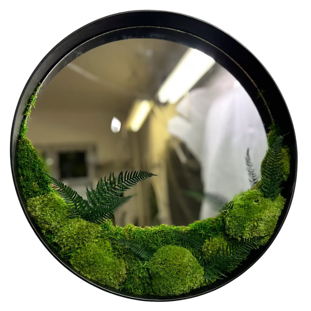 Кругле дзеркало з кульовим і плоским мохом та папороттю – це чарівний декоративний елемент для дому. Скло дзеркала, обрамлене тонкою рамкою з дуба, прикрашене красивим мохом та зеленими листками папороті, створює вражаючий природний акцент у будь-якому інтер’єрі.
