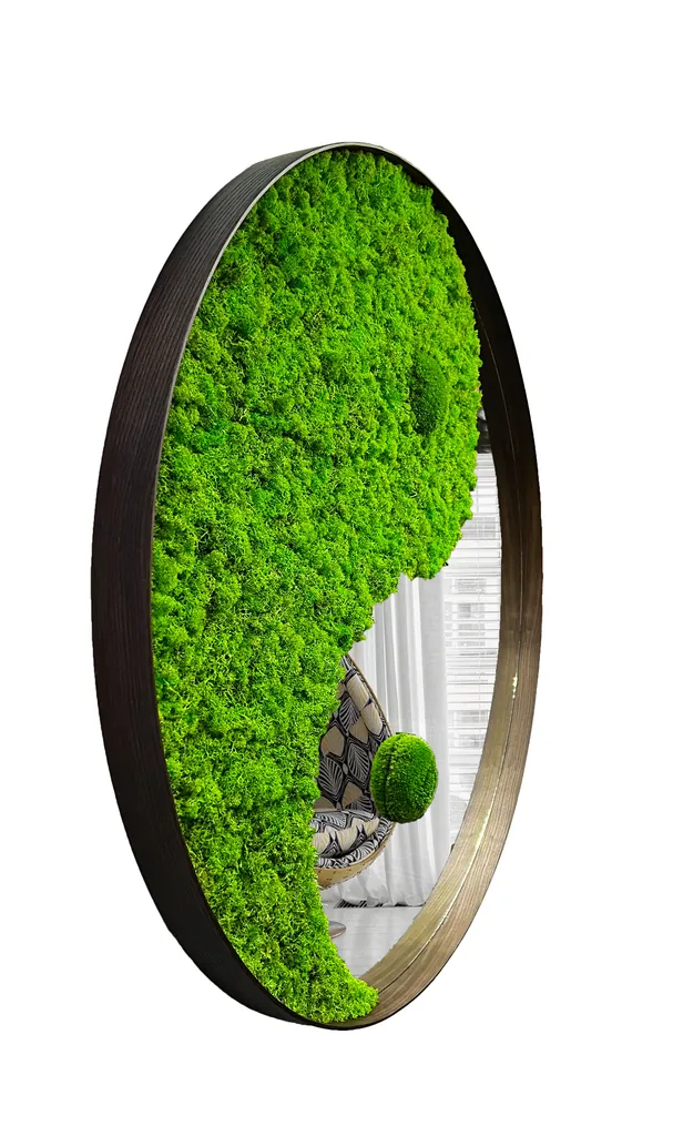 Це поєднання створює заспокійливий та природний вигляд, що пасує до будь-якого інтер’єру. Використання моху замість звичайних дзеркальних матеріалів робить дизайн екологічним та сталим.