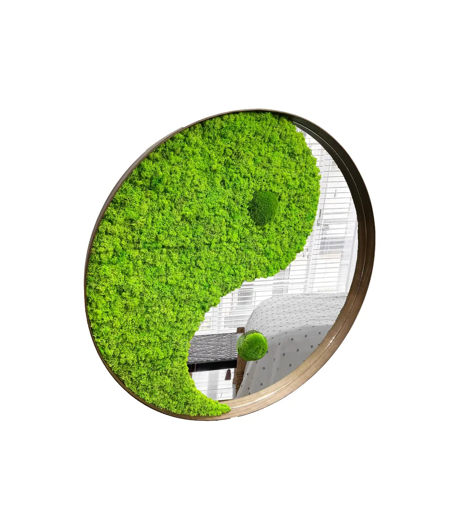 Кругле мохове дзеркало Інь-Янь з ісландським мохом та кульовим мохом – це новий і унікальний дизайн, який поєднує найкраще з двох світів: дзеркало та мохову стіну. Концепція Інь і Ян використовується для підкреслення гармонії та балансу між цими двома матеріалами.