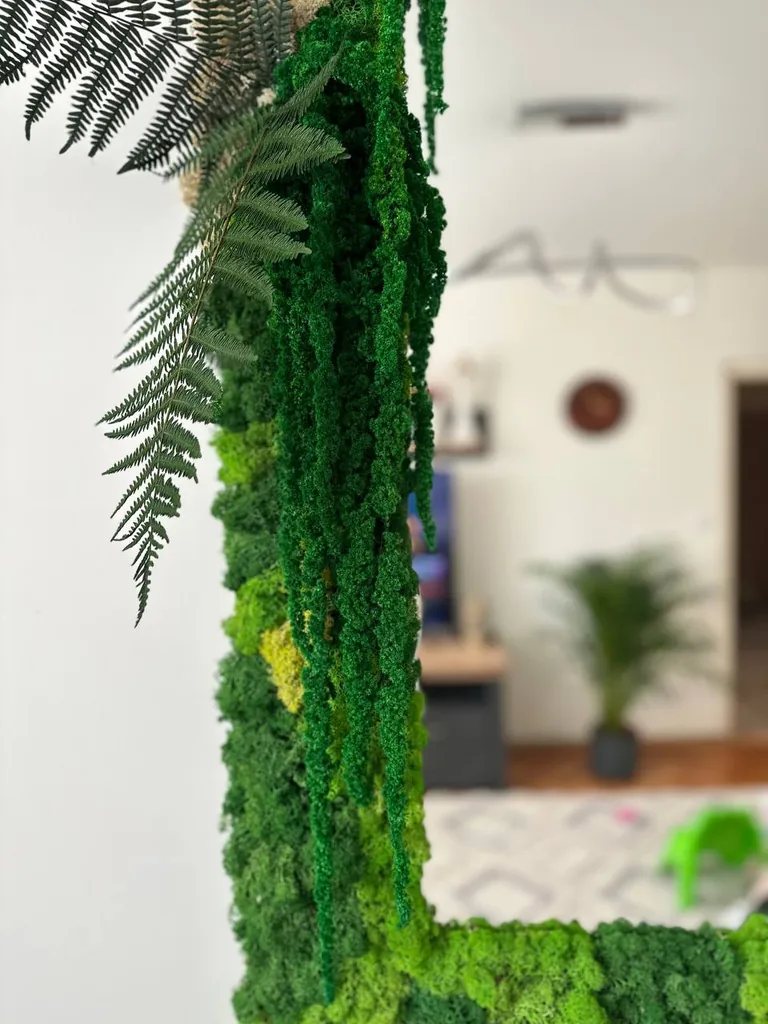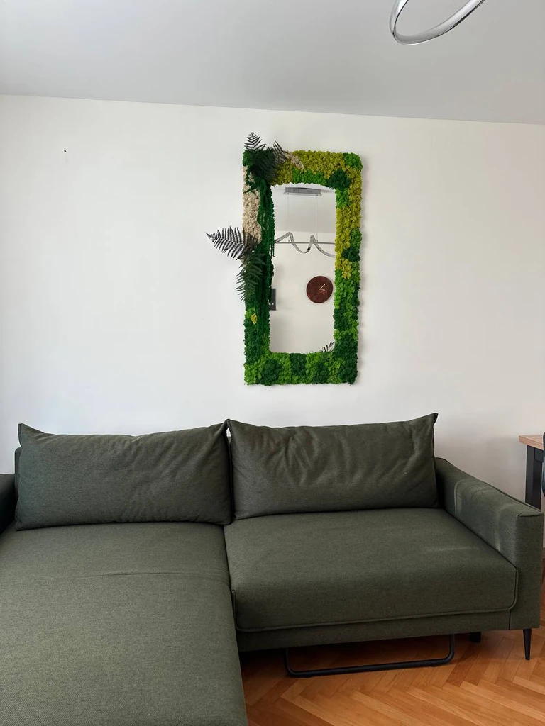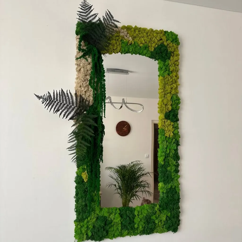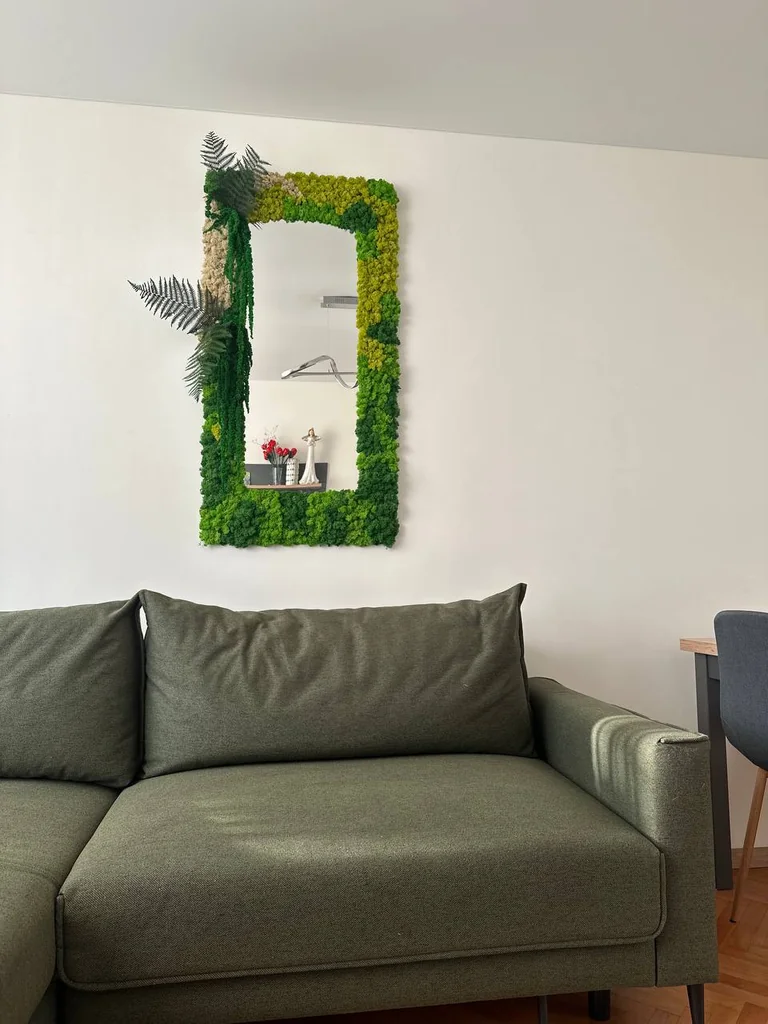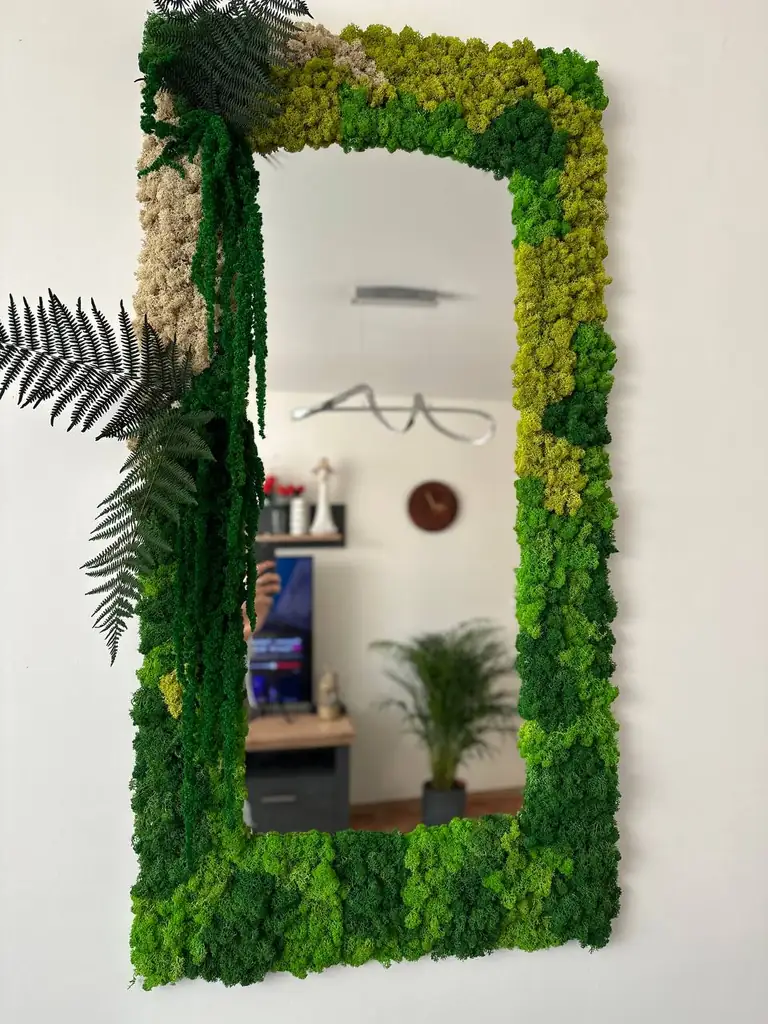 Дзеркало з ягелем та рослинами – унікальний елемент декору, який прикрасить будь-яке приміщення! Ця прекрасна дзеркальна поверхня оздоблена мохом і різними відтінками ягеля (оленячого моху) – від світло-зеленого до темно-зеленого – щоб створити неповторний та виразний вигляд.