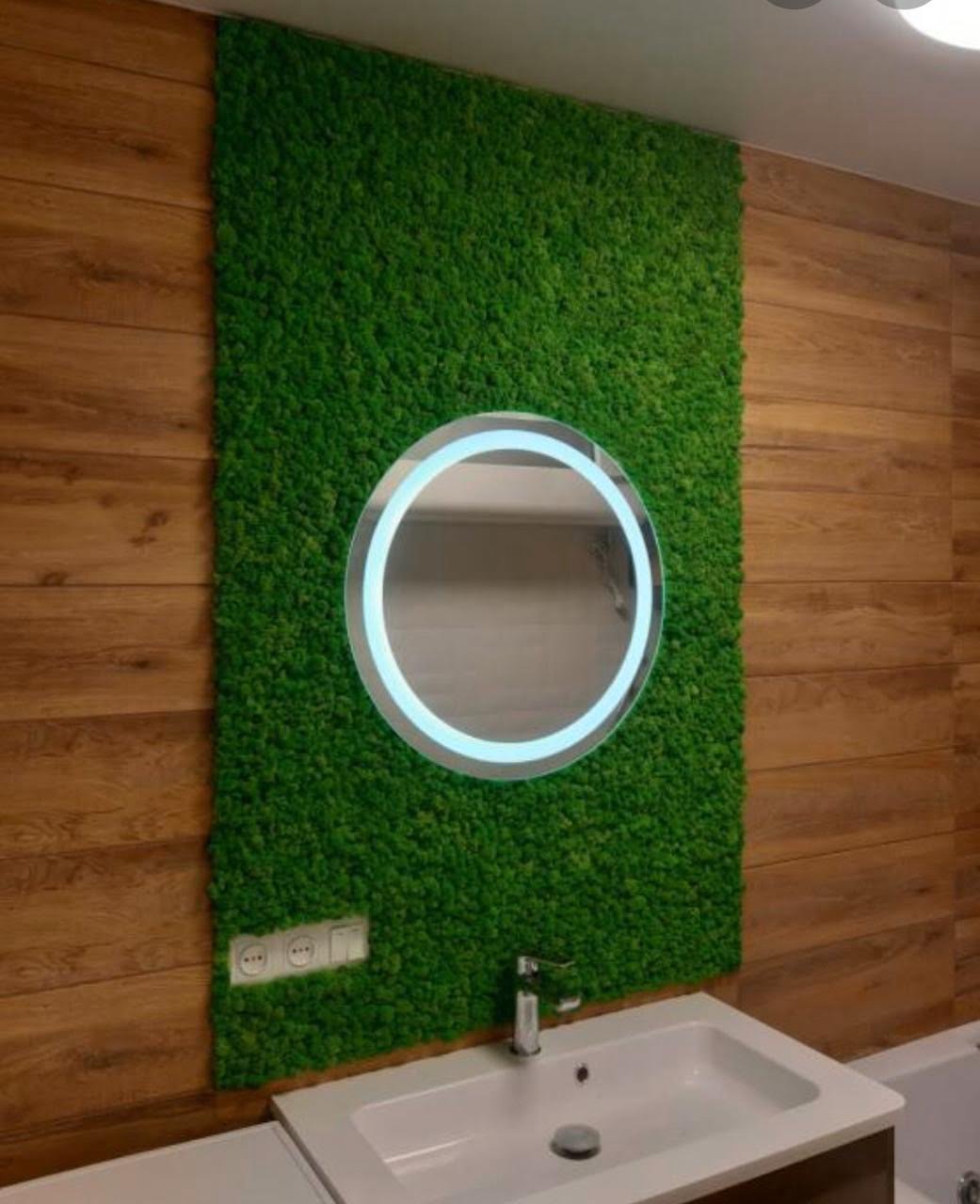 У ванній кімнаті дзеркало з підсвіткою та мохом стане стильним і функціональним доповненням ранкової рутини. Світло від вбудованої підсвітки ідеально підходить для макіяжу чи гоління, а мохове покриття створює приємну та природну атмосферу.